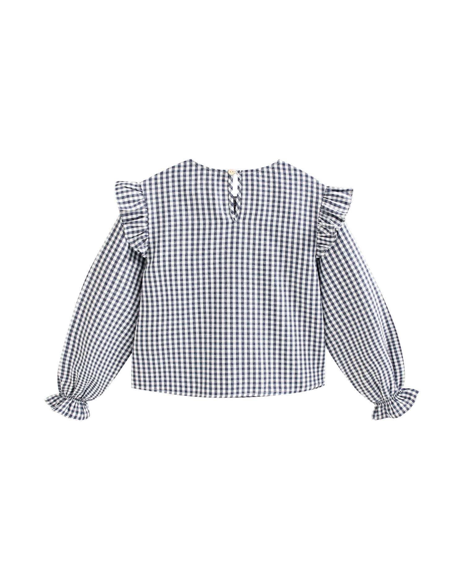 Blouse à carreaux bleu et blanc Vichy pour fille. Volants sur les épaules. Poitrine élastique en nid d'abeille. Manches longues avec manchette élastique. Fermeture boutonnée au dos.