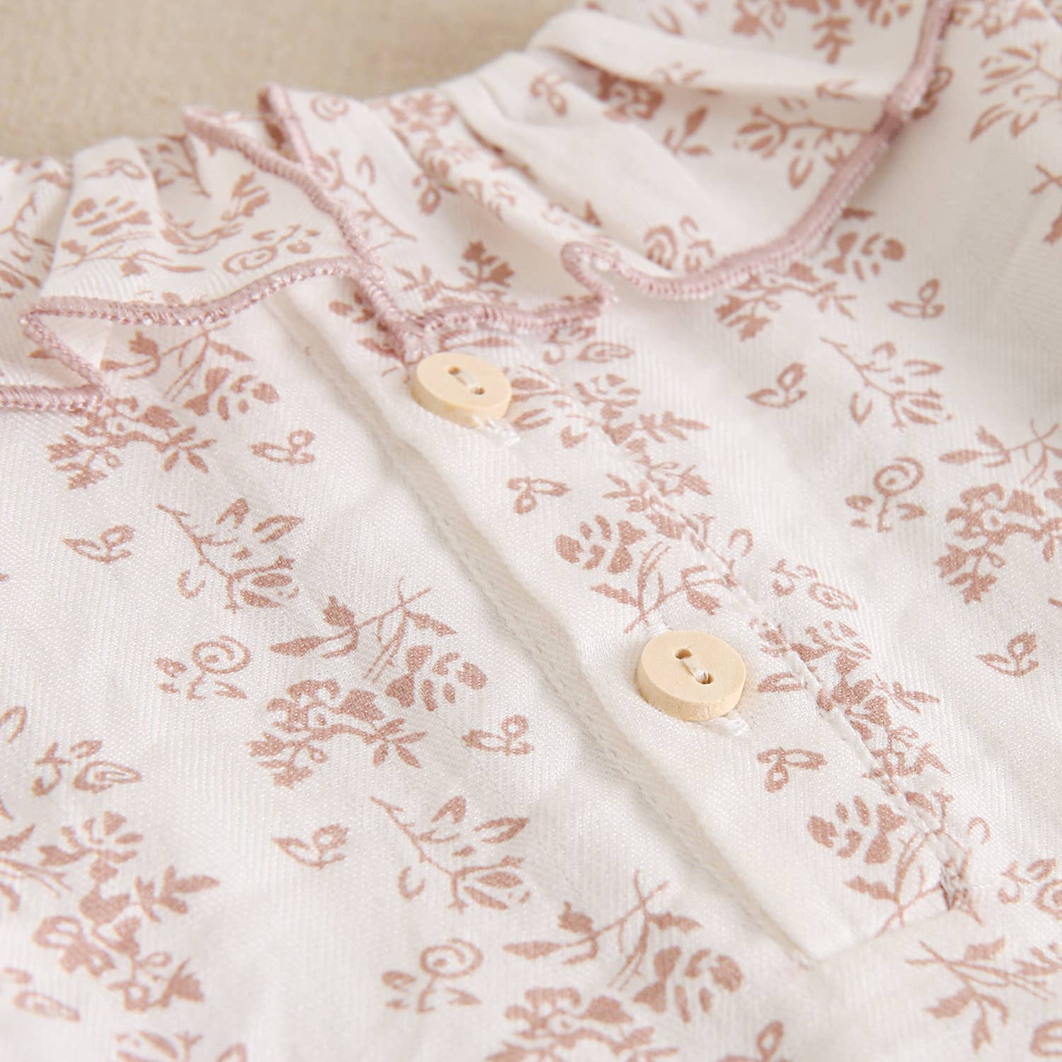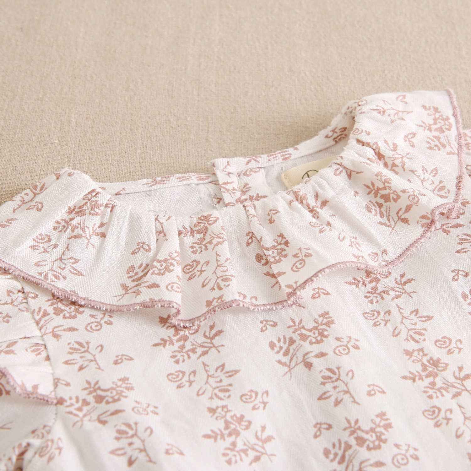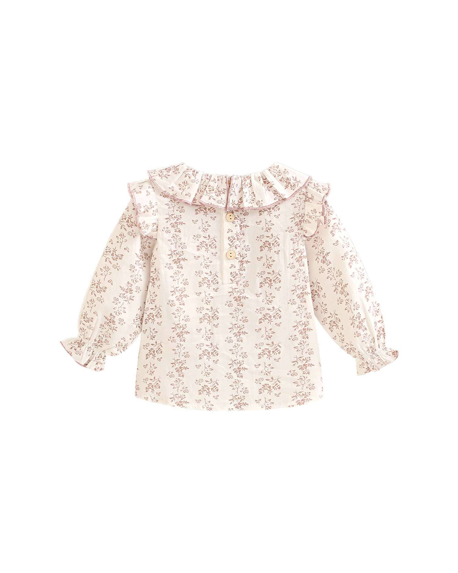 Blouse pour petite fille à imprimé floral rose et col volanté avec broderie rose. Volants sur les épaules. Manches longues avec manchette élastique.