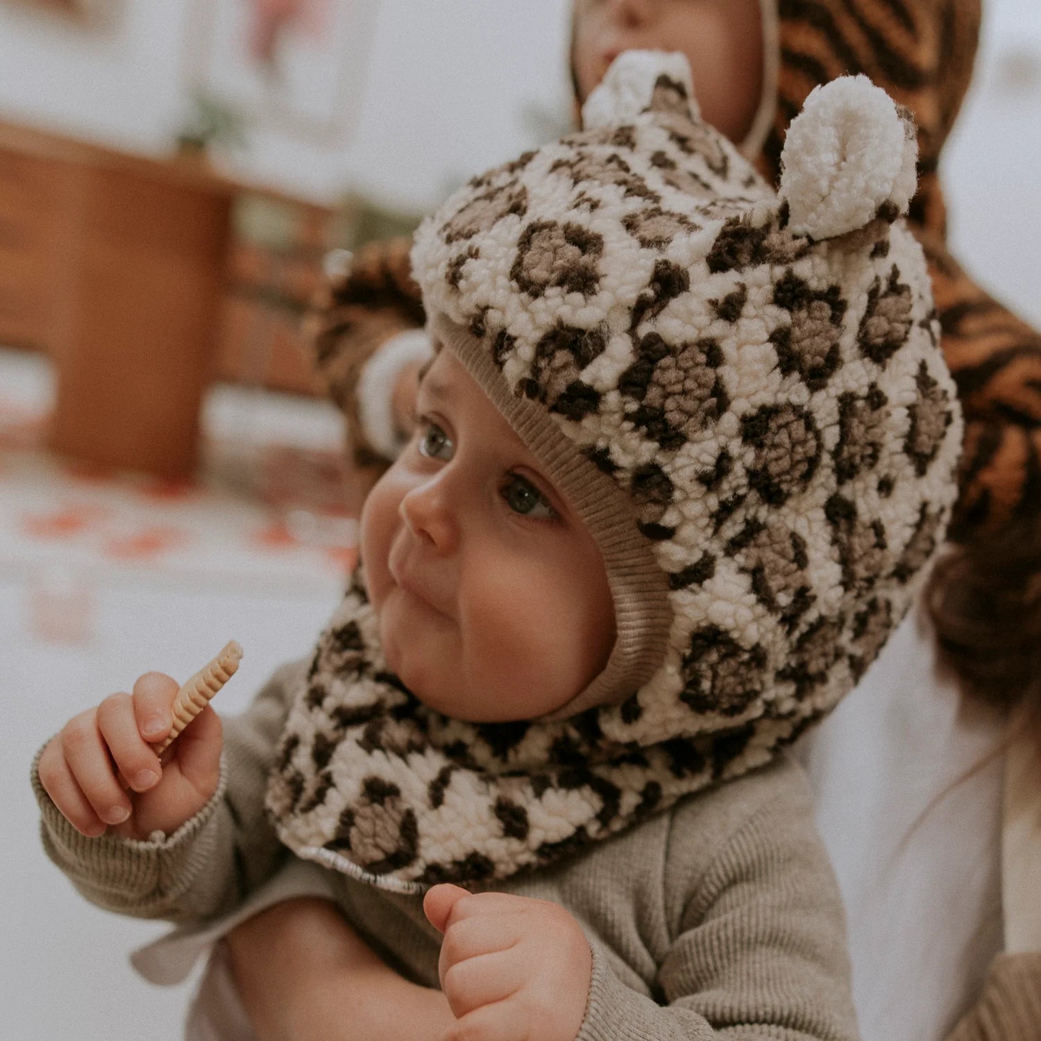 Avec son motif léopard, cette cagoule transforme chaque sortie en mini safari. Un look audacieux et tendance, facile à associer avec un manteau uni ou un look tout doux.