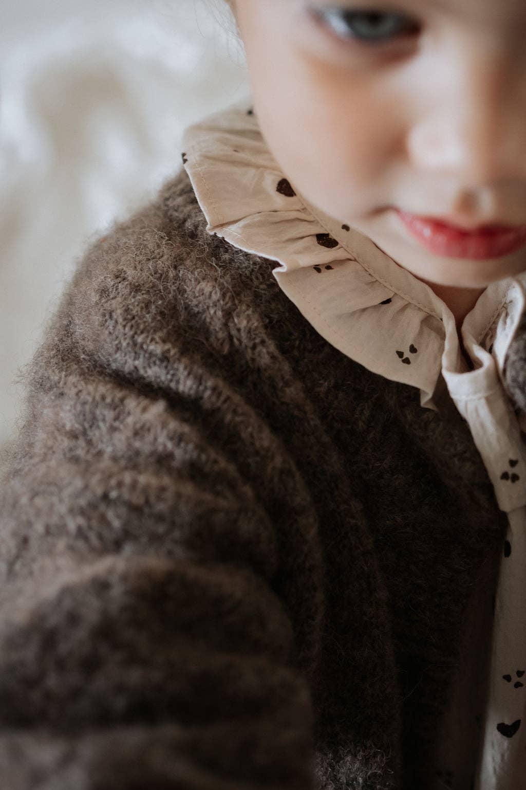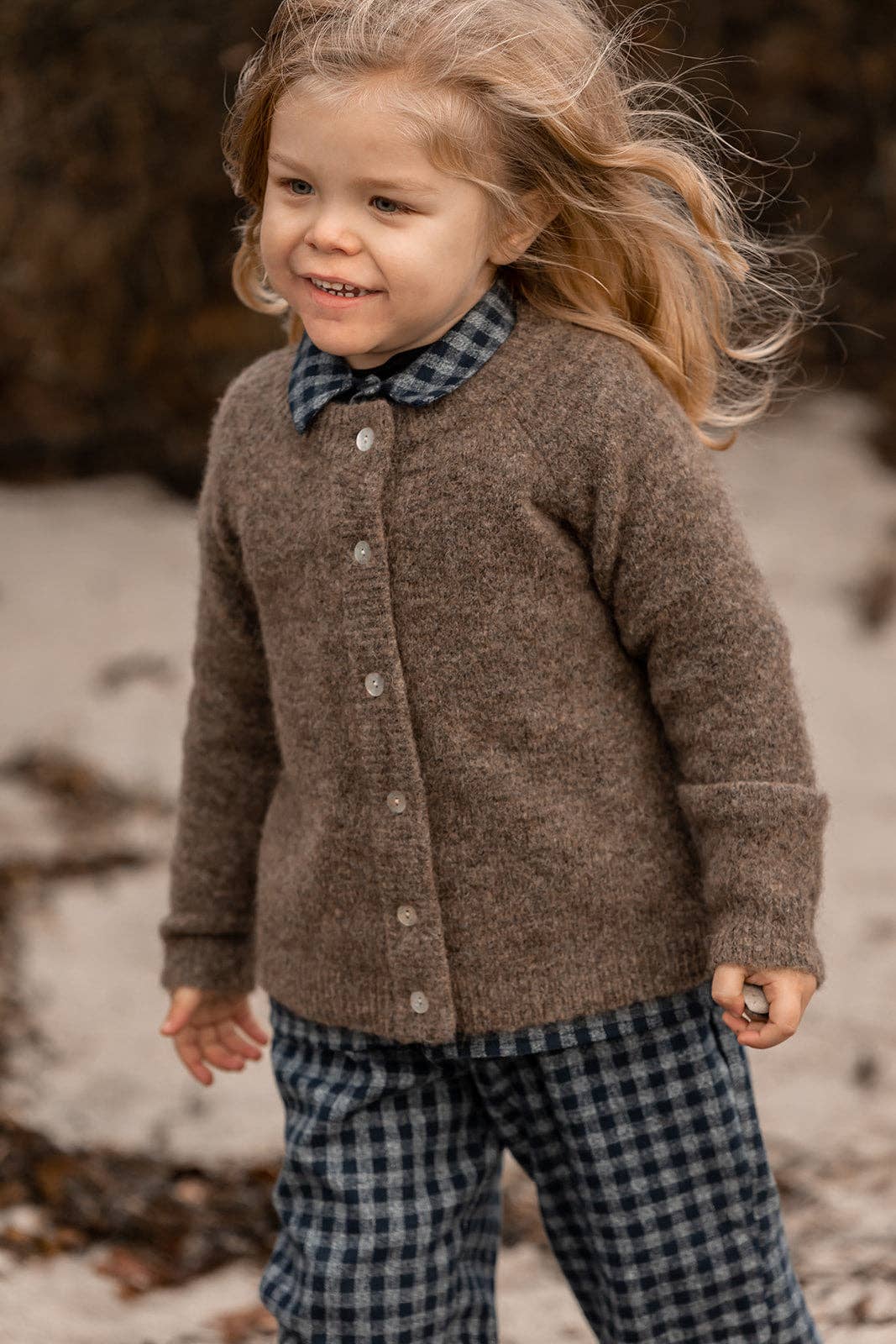 Cardigan tricoté dans une qualité douce et chaude avec 33% d'alpaga et 32% de laine. Le cardigan peut s'ouvrir à l'avant avec des boutons et a un double bord-côte à l'encolure, un bord-côte à la base et au bord des manches.