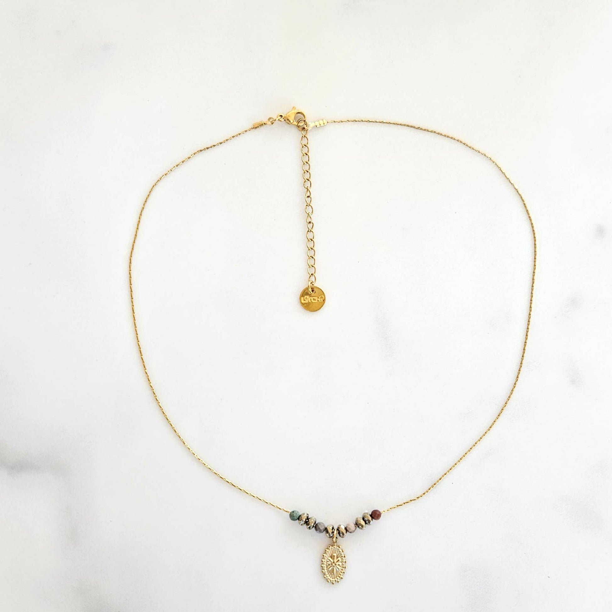 Un collier en pierres naturelles et acier, habillé de la médaille "aura", facile à porter. Longueur 38cm + 5cm de rallonge.