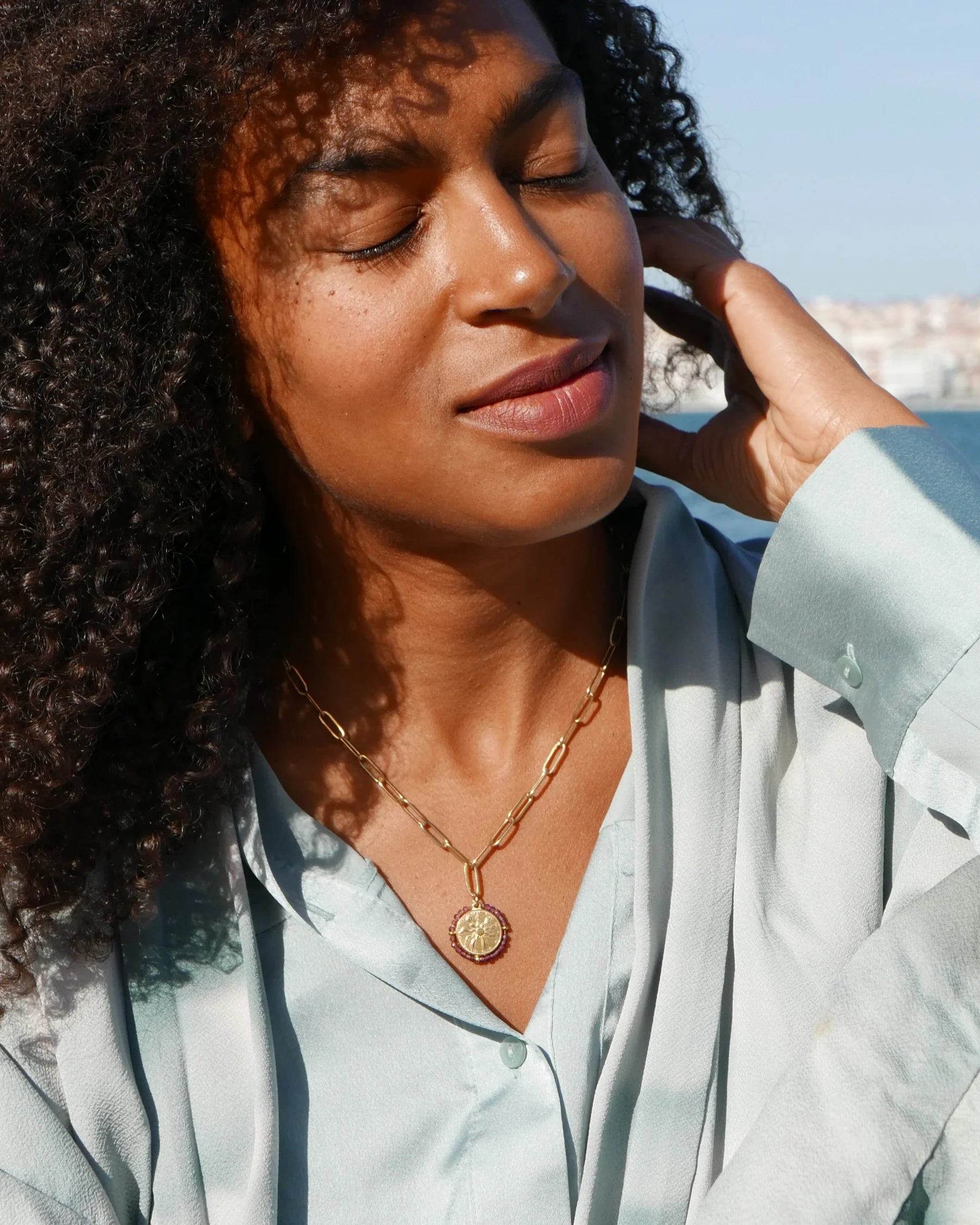 Quand le charme de notre médaille Belamar rencontre la modernité de notre collier chaîne, cela donne naissance à notre médaille Palma. Une chaîne à maillons dorés ornée d'un médaillon serti de pierres semi-précieuses.