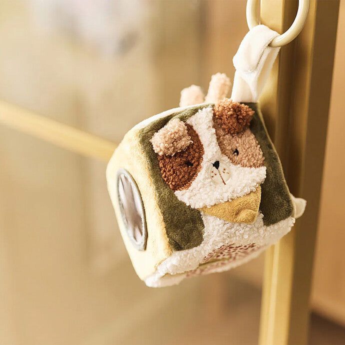 Ce cube d’activités tout doux de la collection Tiny Park est un jouet enchanteur pour votre bébé. Avec des animaux adorables comme un chat, un chien et une chouette, et des éléments interactifs comme des oreilles qui crissent et un miroir, il stimule les sens et le développement moteur de votre tout-petit. Un cube ludique et éducatif, idéal pour des heures de jeu dans le parc ou en balade !