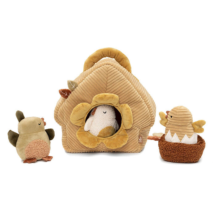 Le Jouet d'Activités Cache-cache créé par Jollein se compose de trois petits oiseaux : Lulu, Chirp et Feather. Bien à l’abri dans leur grande maison d’oiseaux décorée de délicates feuilles, ils attendent qu’on les découvre à travers une ouverture en forme de fleur. Lulu la petite aventurière aime explorer, Chirp le chanteur gazouille joyeusement toute la journée et Feather, le plus espiègle, s’envole en dansant dans les airs.