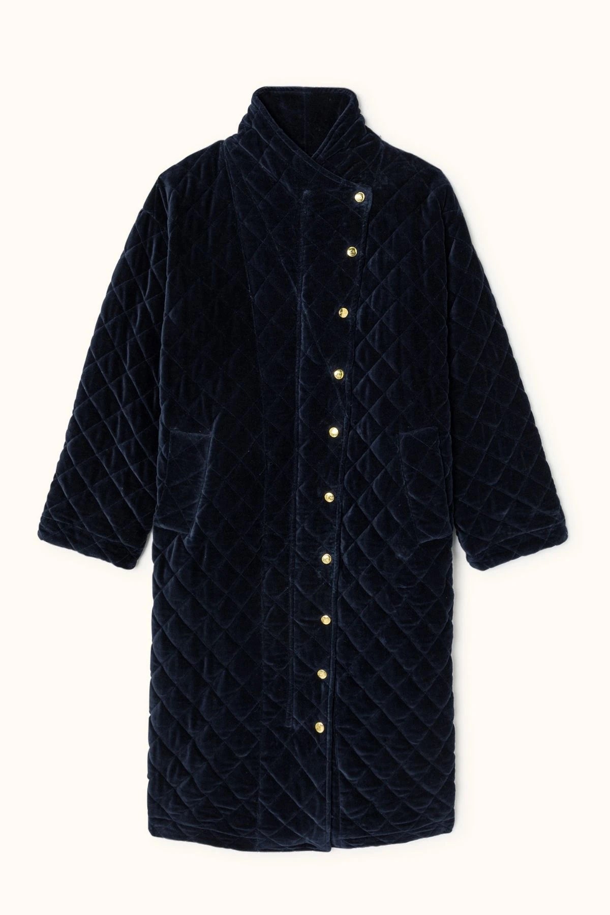 Apaches Collections signe Jiya, le manteau long en velours lisse matelassé, pièce forte et tendance de la saison. Doux, chaud et confortable, il est parfait pour l’automne-hiver. Son col haut croisé, sa fermeture zippée et pressionnée, ses poches latérales et poignets ajustables en font un allié stylé contre le froid.