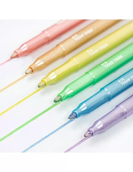Ajoutez de l'éclat à n'importe quel projet avec les marqueurs pailletés de Tiger Tribe ! Ce set de 6 marqueurs pastel avec une finition pailletée est l'outil idéal pour les journaux, les cartes et les œuvres d'art créatives. Non toxiques, inodores et faciles à laver, ils sont parfaits pour les enfants de 5 ans et plus.