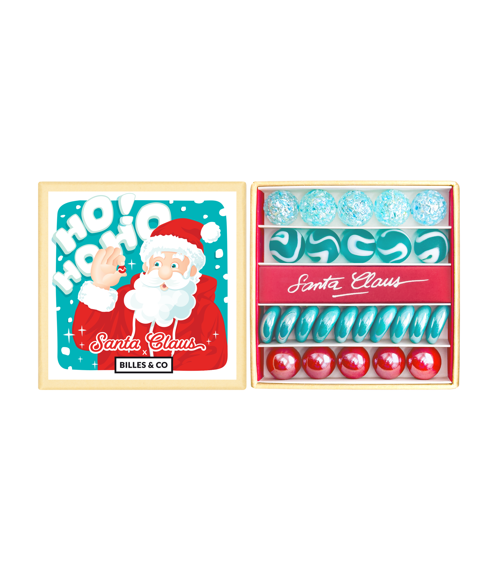 Nous rêvions depuis longtemps de faire un beau coffret avec le Pere Noël. Nous lui avons parlé de notre rêve et il a accepté de le réaliser. Il a bien observé chaque bille de l’Atelier et a sélectionné ses coloris préférés. Il a aussi pris de son temps précieux pour dédicacer chaque coffret de sa main.