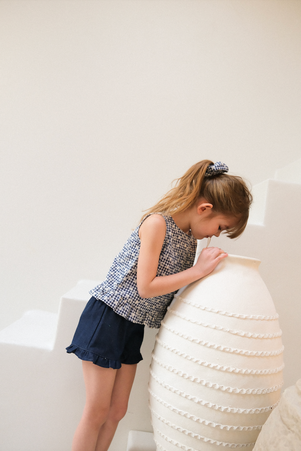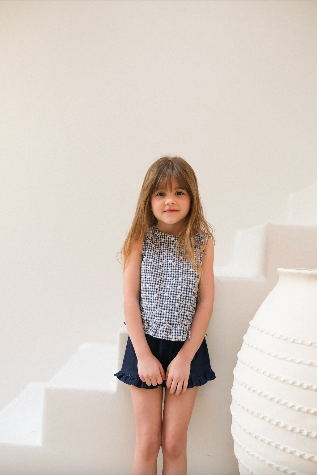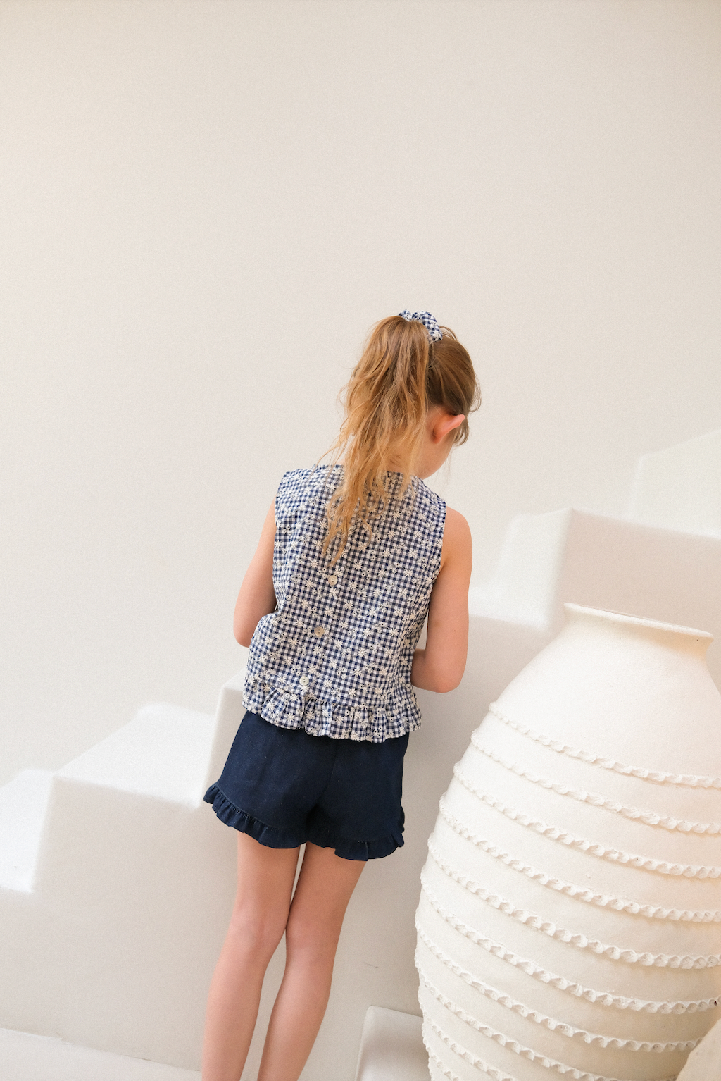 Un petit haut, petit volant dans le bas et boutonnage dos, imprimé vichy brodé marine, le parfait petit haut d'été trop mignon avec un petit short.
